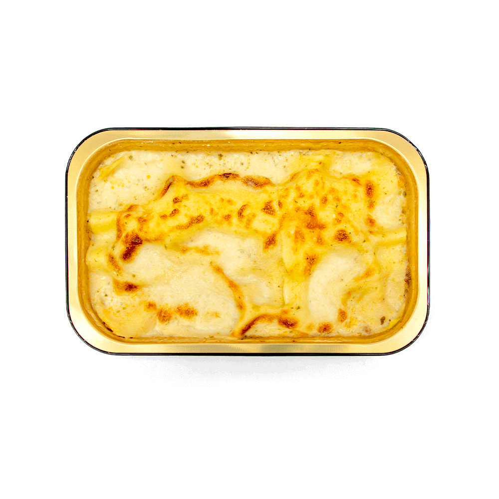 Sfoglia all’uovo, besciamella, carne trita di manzo, mozzarella e Grana Padano D.O.P. (24 mesi).